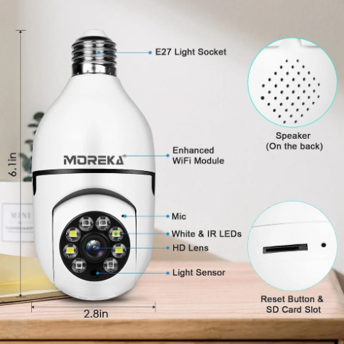 La cámara de seguridad Moreka Modelo JK001 está diseñada para ofrecer una vigilancia completa y eficiente. Con un cabezal de lámpara E27 general, su instalación es extremadamente sencilla. Esta cámara admite iluminación de doble luz y ofrece un ángulo de rotación y traducción de 360 grados, permitiendo una visualización remota desde tu móvil a través de conexión wifi. Además, cuenta con detección inteligente de movimiento humano y alarma anormal, activando automáticamente una alarma cuando detecta intrusos. El intercomunicador de voz bidireccional inteligente en tiempo real y el soporte para tarjetas de memoria de hasta 64G, almacenamiento en nube y tarjeta TF, garantizan que siempre estés conectado y seguro.