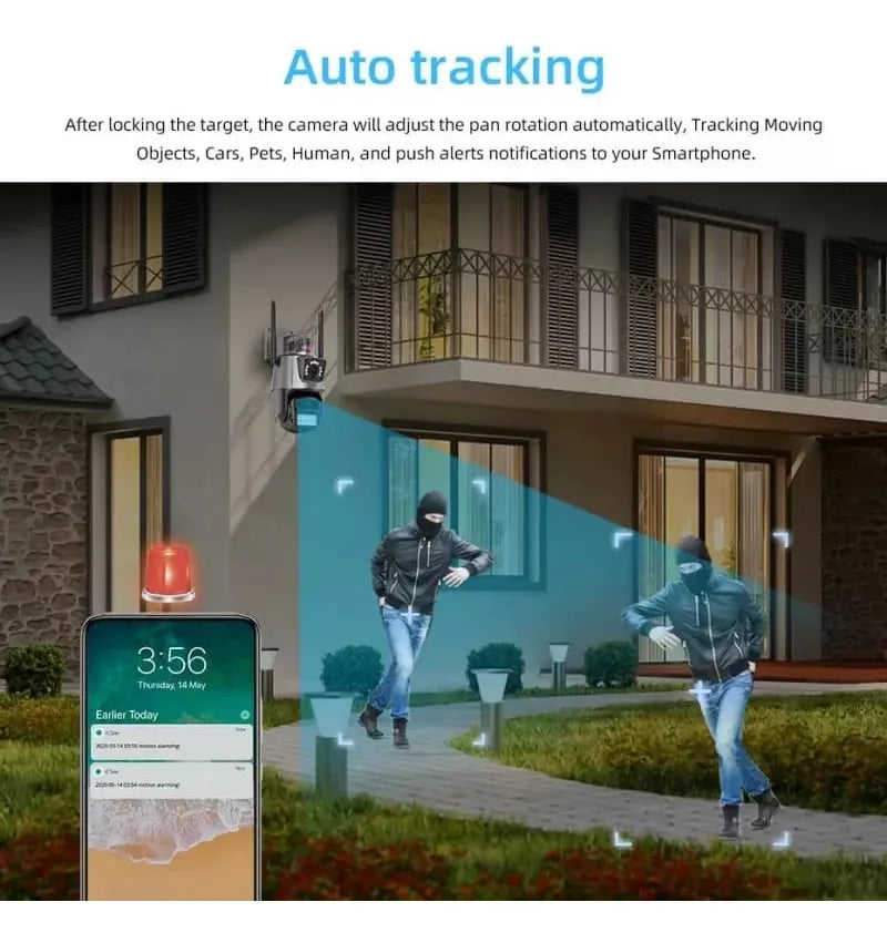 Esta cámara incluye VISIÓN NOCTURNA A COLOR con potentes luces LED infrarrojas y blancas, asegurando imágenes nítidas incluso en total oscuridad. Además, cuenta con DETECCIÓN DE MOVIMIENTO inteligente con notificaciones en tiempo real, y una SIRENA DE ALERTA CON LUCES ROJAS Y AZULES para disuadir intrusos.